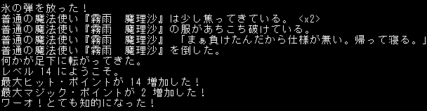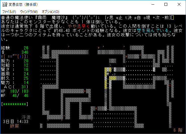 地下6階の地図を埋めていたら『霧雨魔理沙』を発見。魔理沙のドロップは耐性付きかもしれません。拾うためにザックの中身をぶっ壊す必要があるな。