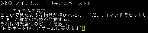 魔理沙はアイテムカード『キノコペースト』を落としました。カードの能力は閃光のビームです。たぶんイリュージョンレーザーと同じ効果でしょう。