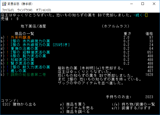 ザックの中にある未鑑定の薬を売ってしまおう。これによりザックの中身が1つ空きました。道中で放置をした未鑑定の薬も売るのだ。この売買により多くの薬の正体が分かります。