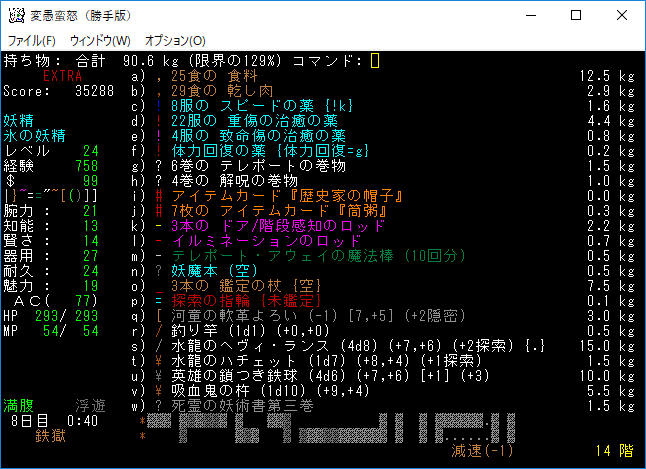 地下14階の探索が終わりました。探索の指輪と釣り竿は壊してしまおう。吸血鬼エゴは地獄耐性がつくらしいから持ち運びます。