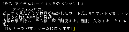アイテムカード『人参のペンダント』を入手しました。ヒット&アウェイの効果なのかな。忍者はあまりプレイしたことないから分かりません。