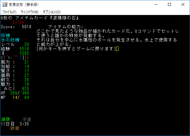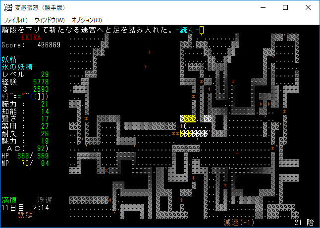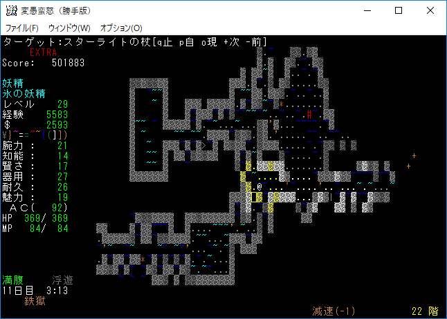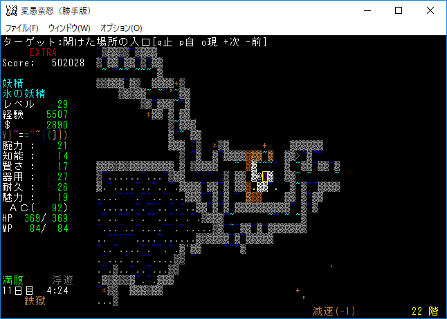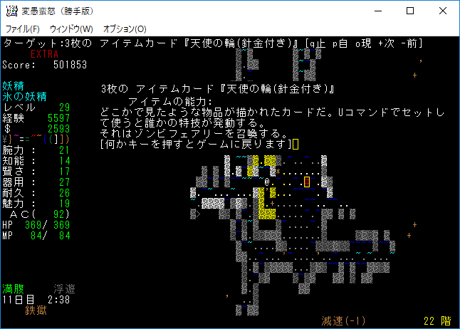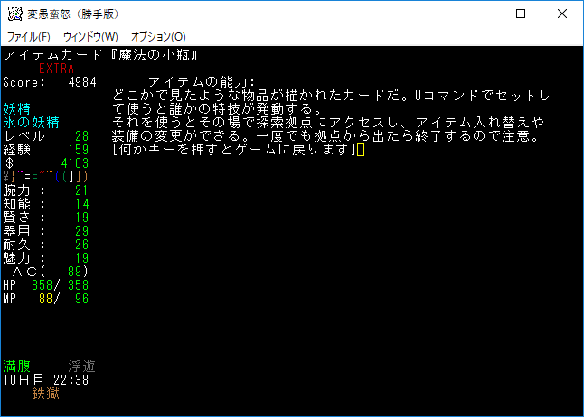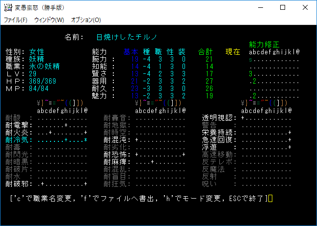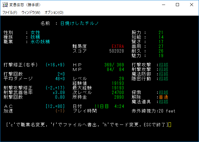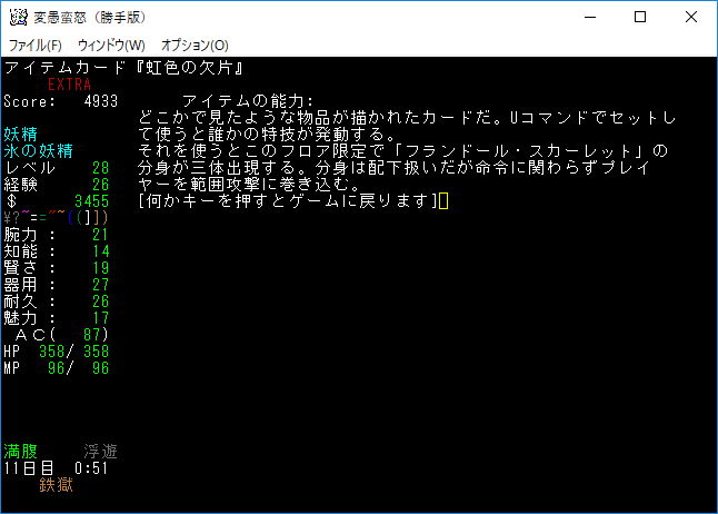 変愚蛮怒東方Project勝手版のプレイ日記を始めます。難易度EXTRAの日焼けしたチルノをプレイ中です。ミミッククエストはアーティファクトを拾えたし幸運だったね。今回も全力で頑張ります。