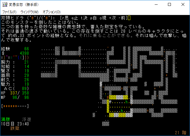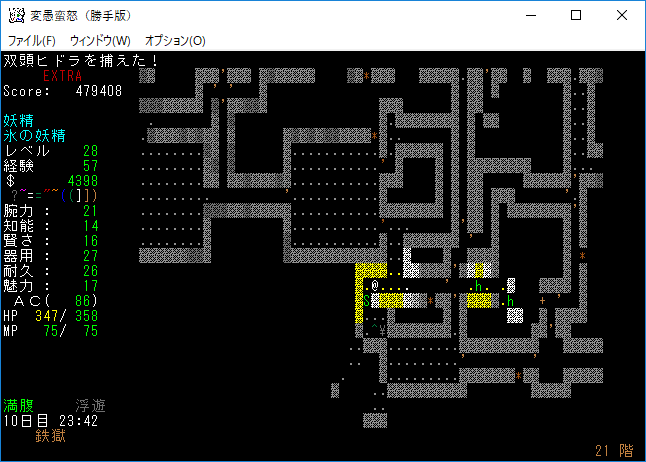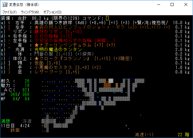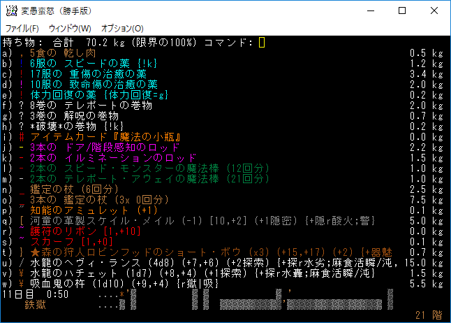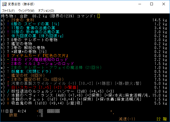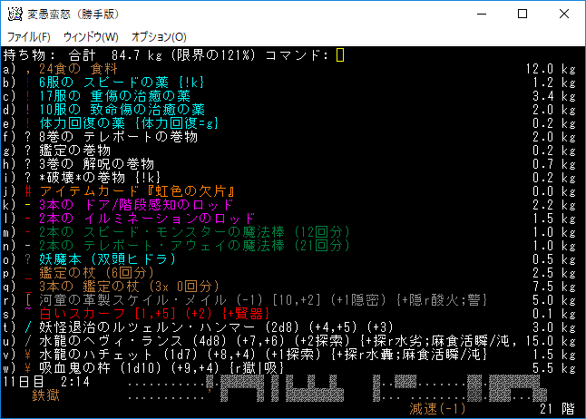 地下21階の探索が終わりました。何気なく拾ったルツェルン・ハンマーが妖怪退治エゴでした。このエゴ武器はちょっと微妙だから捨てるかも。可能ならば売りたいが無理だろうし。