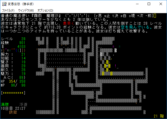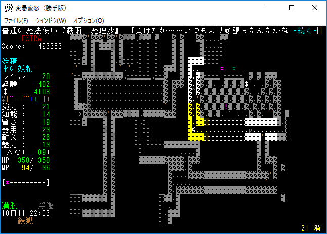 多種多様な冷凍攻撃をくらわせて霧雨魔理沙を撃破する。フロア生成後に出現したせいか装備品をドロップしなかった。