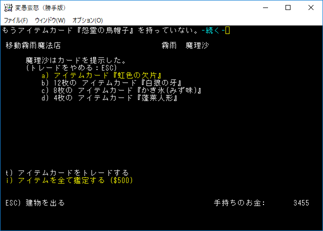 現在は地下21階を探索しています。このフロアの施設は移動霧雨魔法店だ。鑑定のチャンスだとアイテムをかき集めていたら霧雨魔理沙と遭遇する。