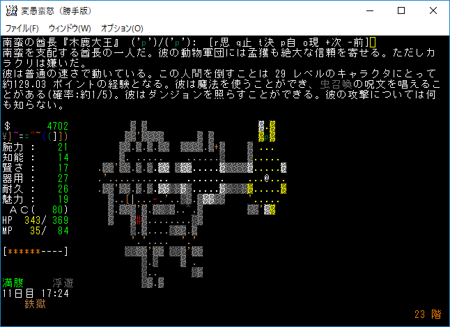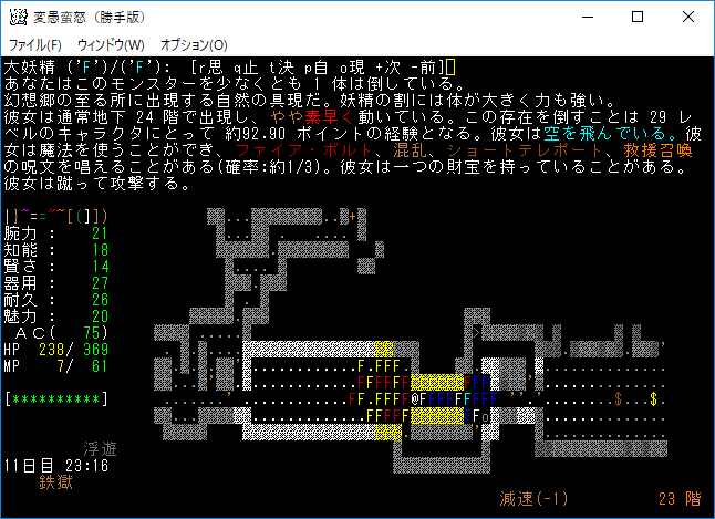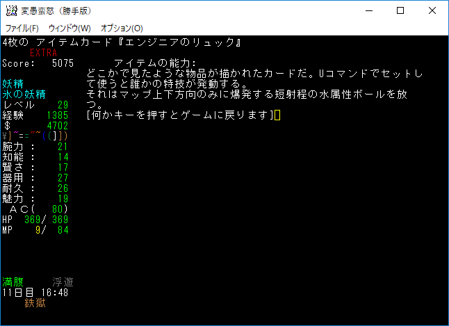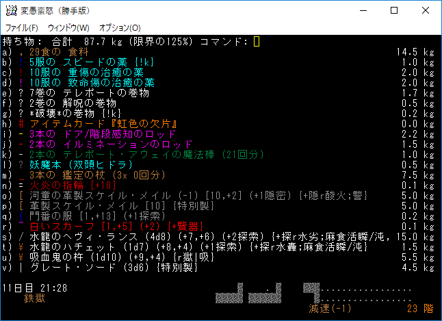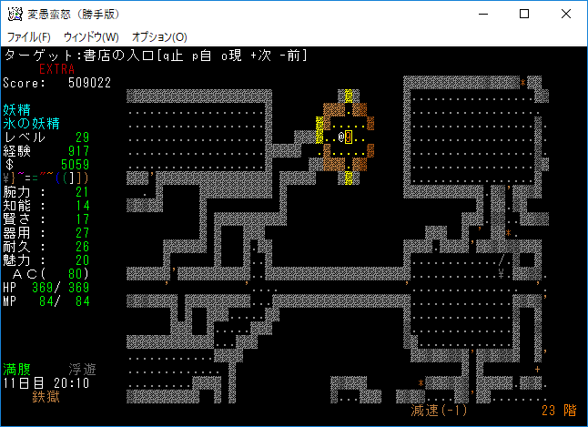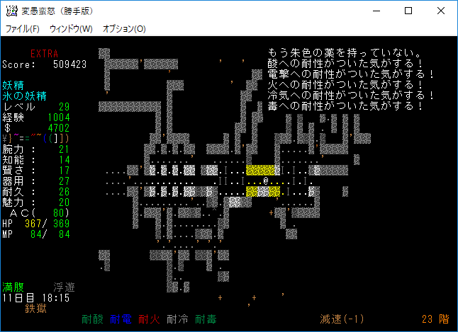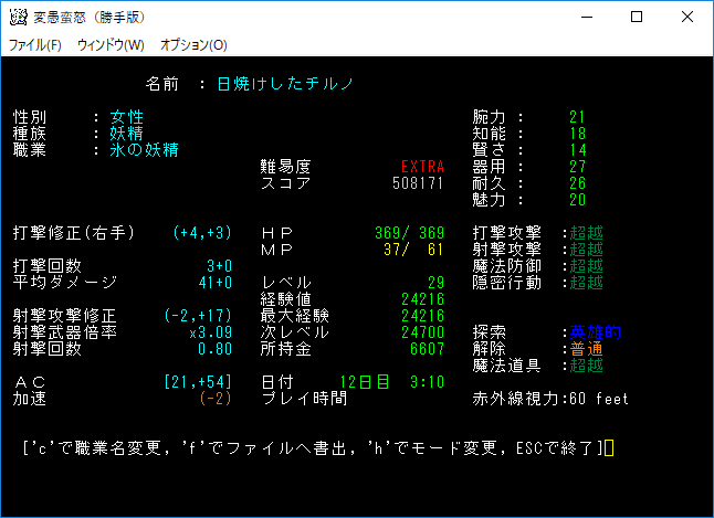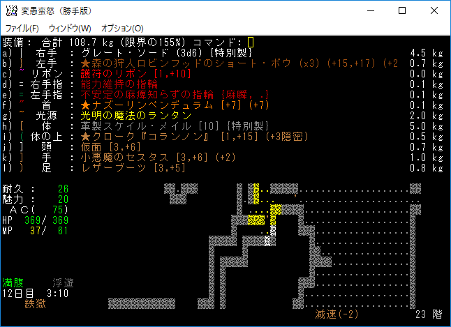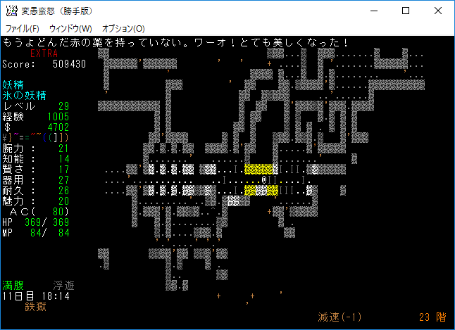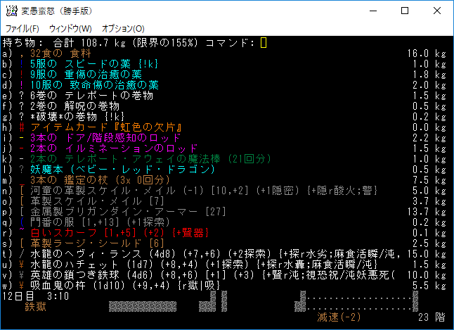 変愚蛮怒東方Project勝手版のプレイ日記を始めます。難易度EXTRAの日焼けしたチルノをプレイ中です。高級品の装備がかさばってきました。*鑑定*をするチャンスが来ないから取捨選択が大変だね。