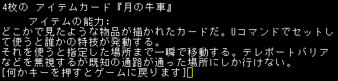 『ミーメ』には金を盗まれてテレポートされました。放心していたらアイテムカード『月の牛車』をゲット。効果は次元の扉だよね。序~中盤にゲットしても微妙だから放置するかも。