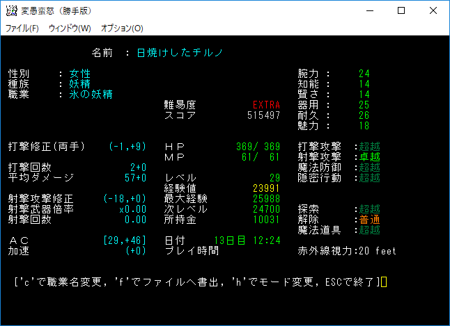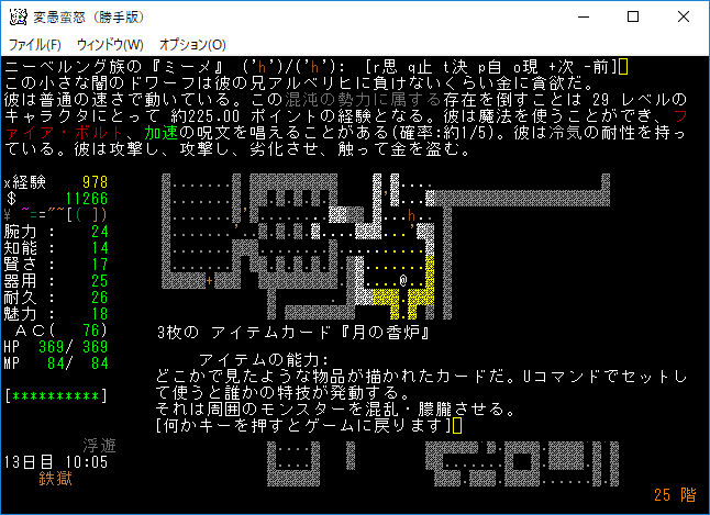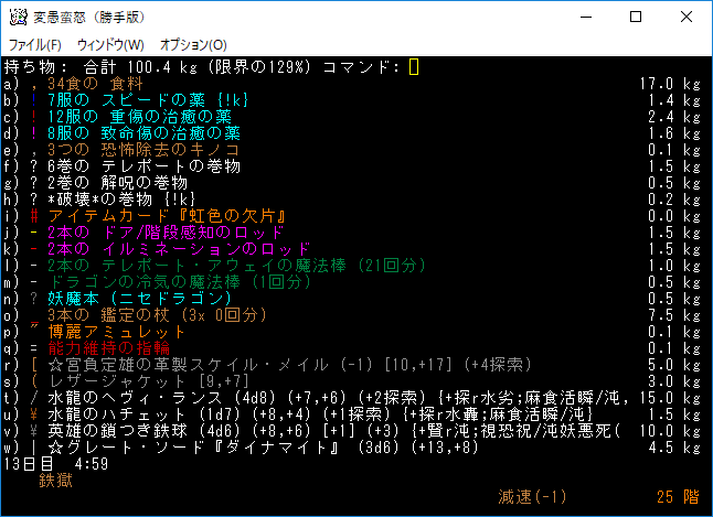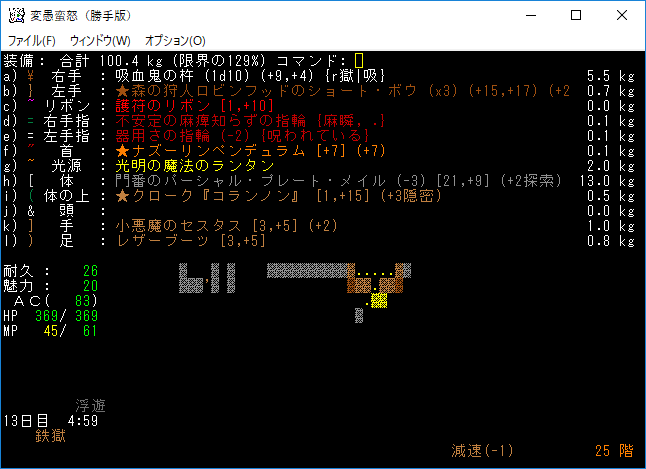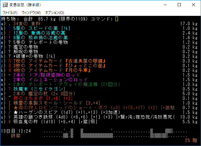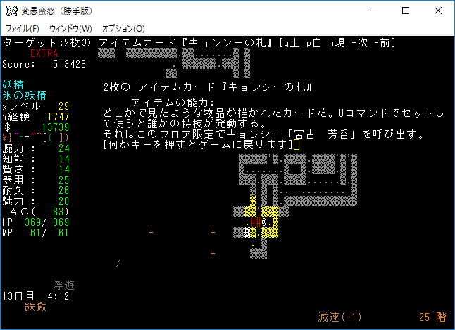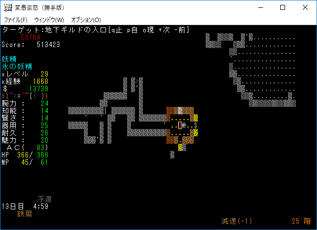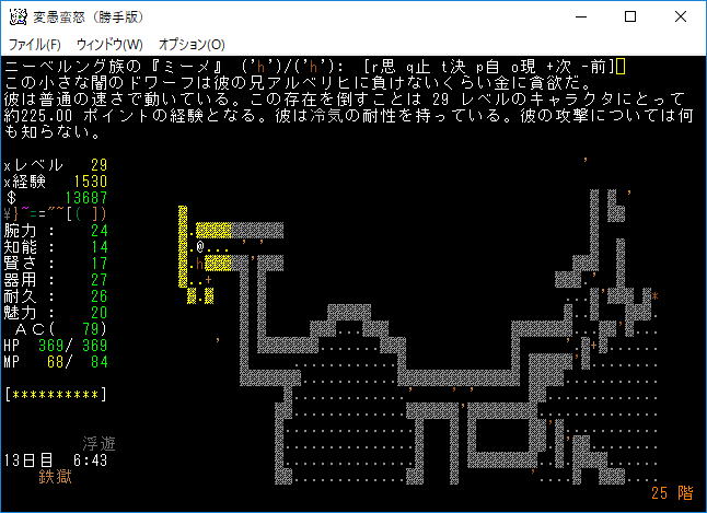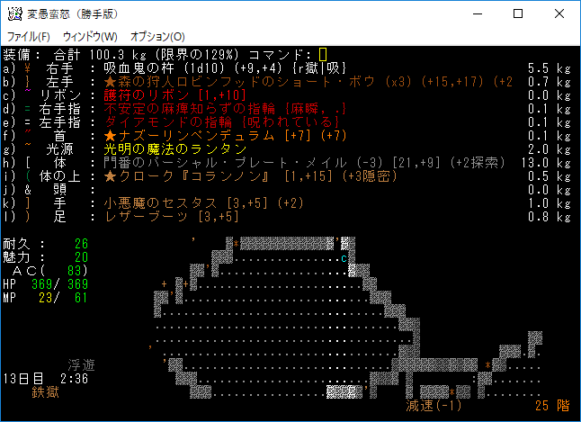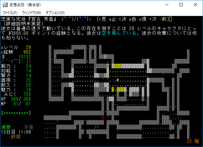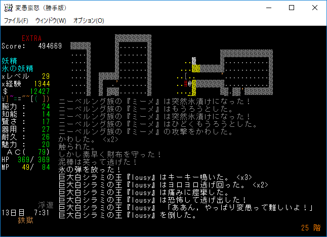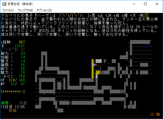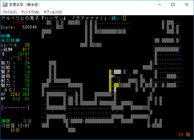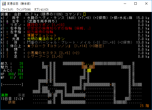 変愚蛮怒東方Project勝手版のプレイ日記を始めます。地下25階を探索するも施設は発見できず。レッサー・ヘル=ビーストは強いから気をつけよう。
