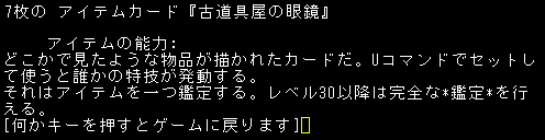 アイテムカード『古道具屋の眼鏡』を入手しました。発動すると*鑑定*の効果があります!だけどレベルが29に下がったので使用するのは当分先になるかな。