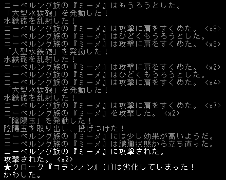 ニーベルング族の『ミーメ』と遭遇。こいつは劣化攻撃をしてきたはずだ。未鑑定の装備品を拾うために水龍のヘヴィランスは置いてきたからマズイ。