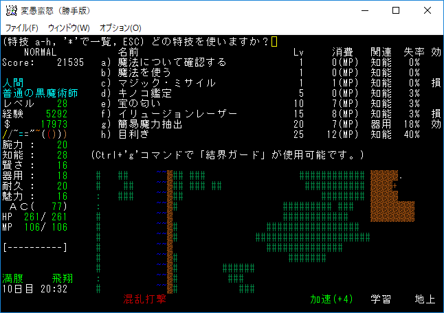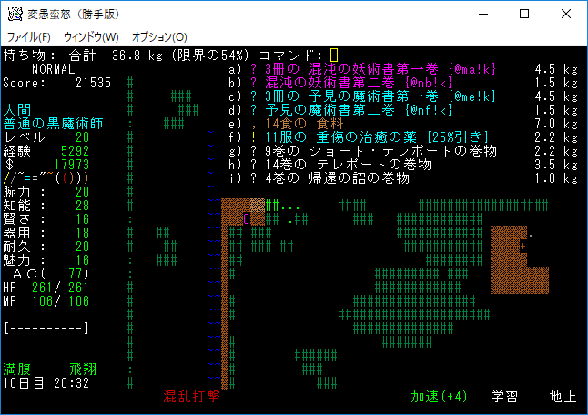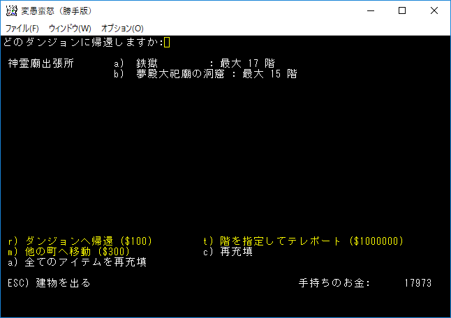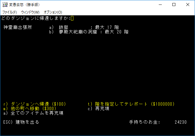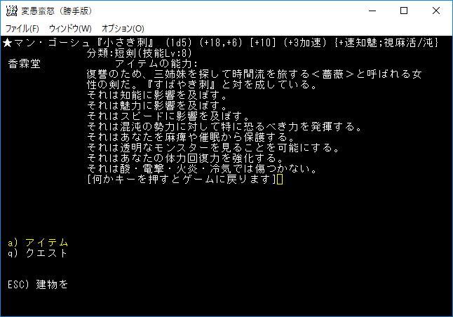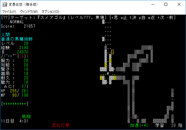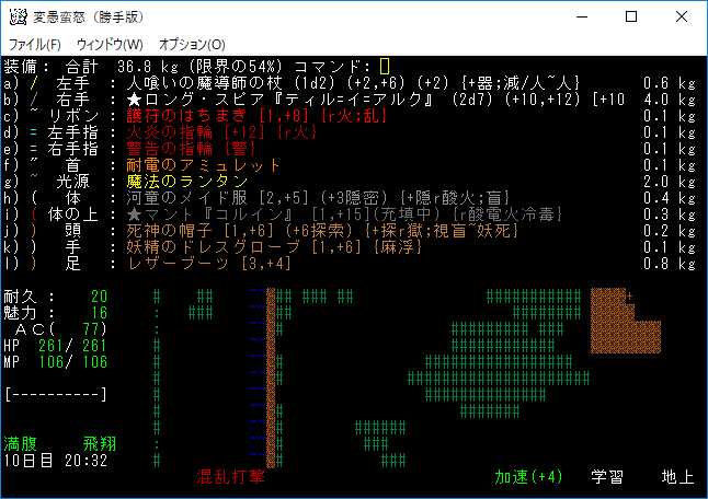 おはようございます。変愚蛮怒東方Project勝手版のプレイ日記を始めます。今回は夢殿大祀廟を探索したいと思います。できることならば最深部の30階にまで到達したい。wikiを見たら夢殿大祀廟は宝石(自作魔法の素材)が特産物と書いてありました。ミミックのクエストを遂行するにあたり素材を集めたいのです。
