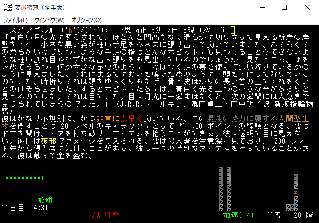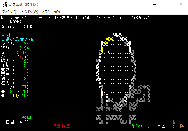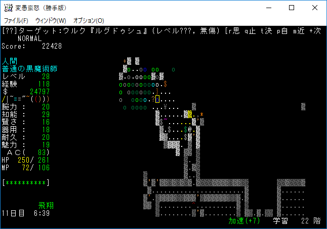 地下15階にて東夷『ブロッダ』と遭遇。こいつは南蛮ユニークみたいな能力だったかな。魔力の炸裂を連打して撃破。落としたアイテムは上質の装備でした。