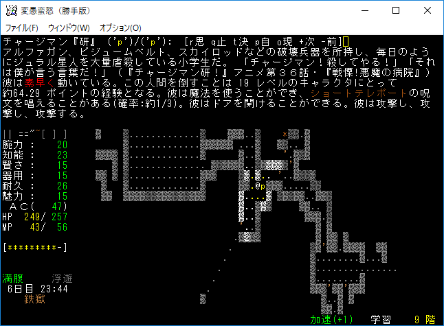 チャージマン『研』と遭遇しました。自分はこのユニークモンスターと戦うのは初めてです。やたらとショート・テレポートで逃げ回る敵だ。