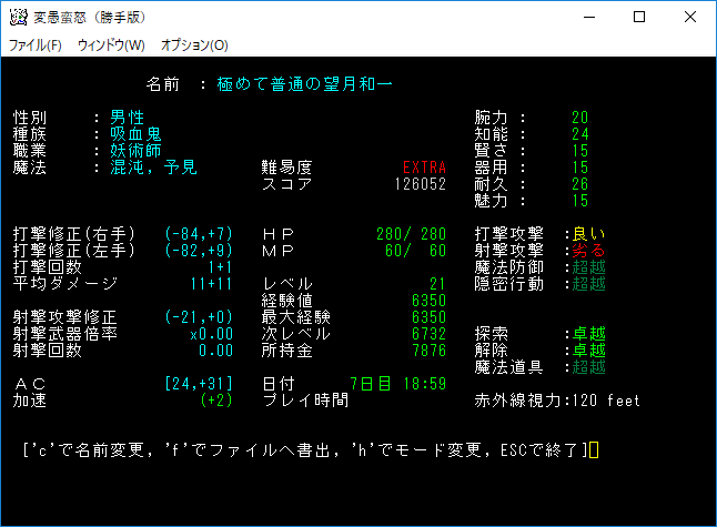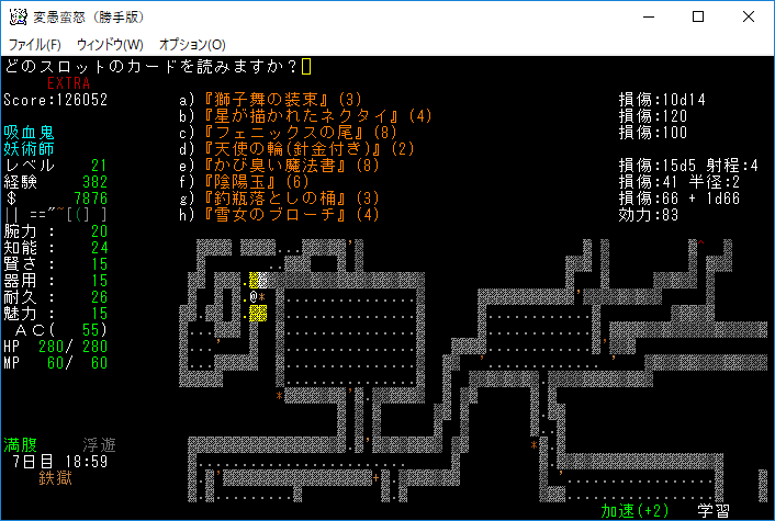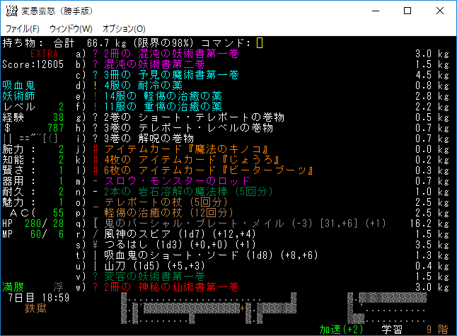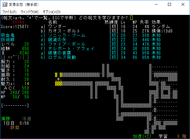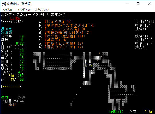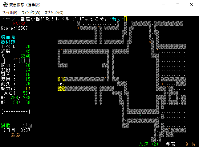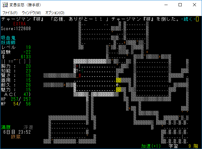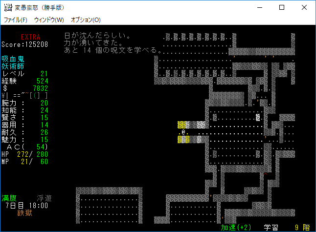 変愚蛮怒東方Project勝手版のプレイ日記を始めます。難易度EXTRA、種族吸血鬼のメイジをプレイ中です。次の階に降りるとオークキャンプのクエストが始まる。準備を整えて万全の態勢で挑もうか。