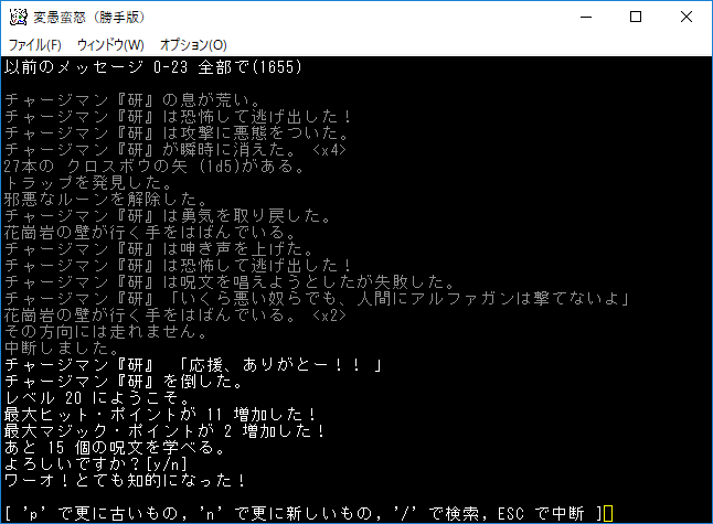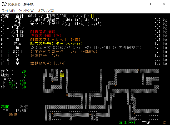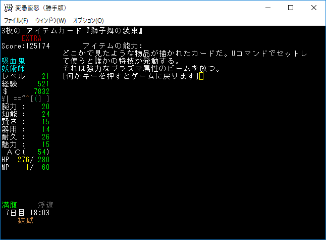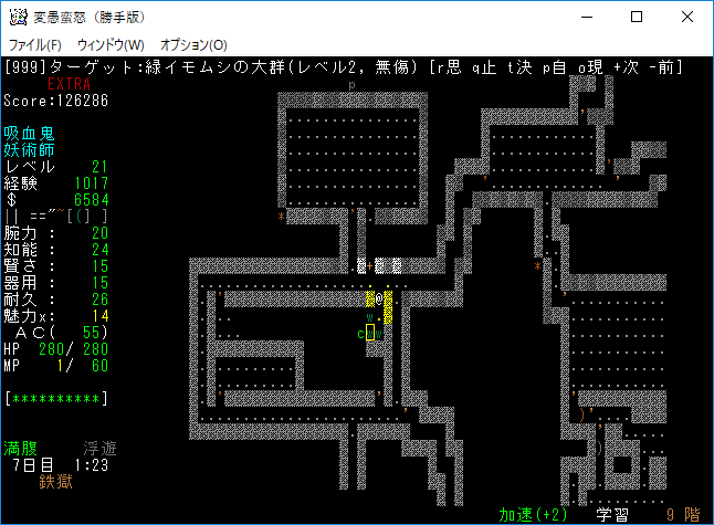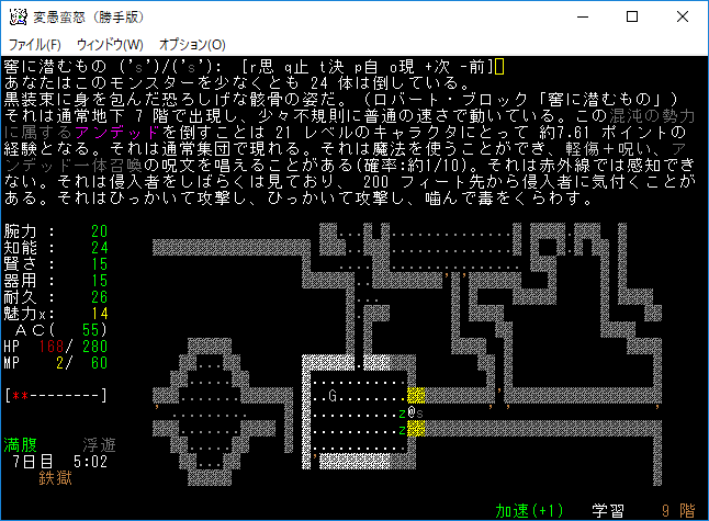 死体の塊を発見したので経験値稼ぎをしました。本家だと地下20階相当の敵だった記憶がある(たぶん)。こいつに触られると耐久の最大値が下がることもある。接近戦はしないようにしよう。