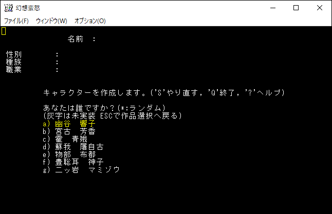 神霊廟を選択したところ7人のキャラクターが表示されました。今回も上から順番に調べていきましょうか。東方変愚だけでしか楽しめないピーキーな戦闘システムで、育成するロマンがあり、強いけどチート級の最強キャラではなく、最終的には混沌のサーペントに100%勝てるキャラクターを探すぞ(要求が多すぎる)。