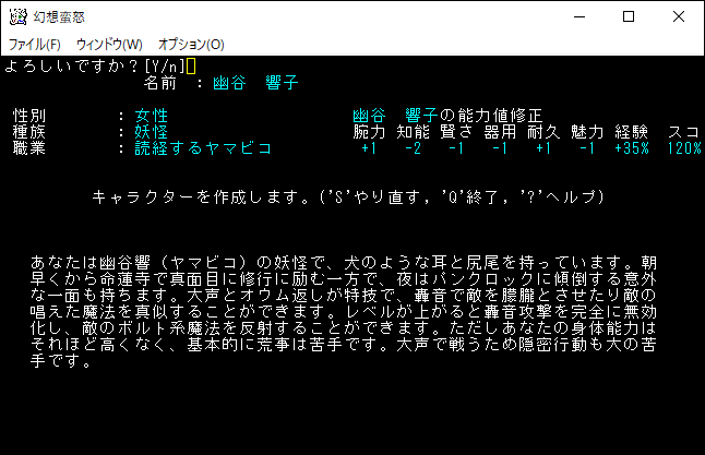 幽谷響子はパンクロックが好きなヤマビコの妖怪です。ふーん、パンクロックを聴いているんだ。得意な攻撃属性は「轟音」であり、戦闘システムは本家の吟遊詩人と似ている。また響子はヤマビコなので、視界内で最後にモンスターが使用した魔法を唱える特技「マウンテンエコー」を使えます。普通に強いキャラクターに思えるがwikiでの評価は上級者向けになっています。響子は吟遊詩人と同じく隠密が低いので、そこがマイナス要素になっているのだろうか。まあHPも低めで壁抜けもできないから難しいよな。