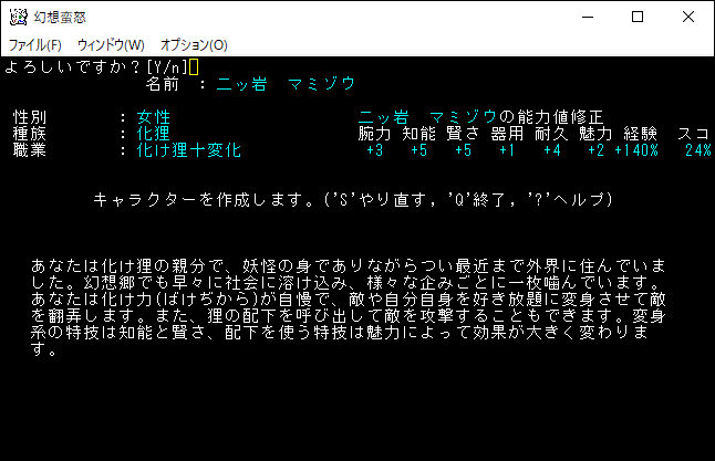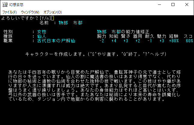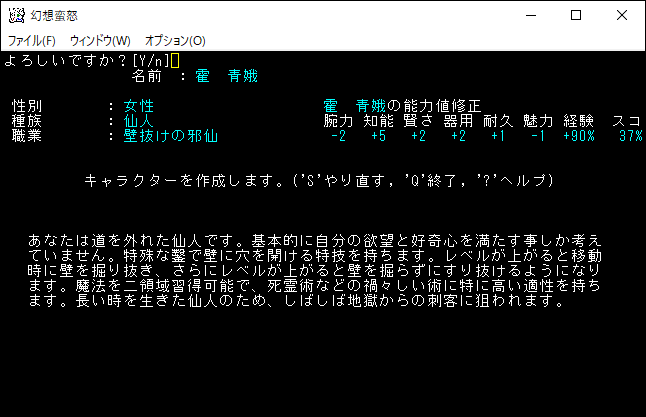 霍青娥は全ての魔法領域から2種類の魔法を習得できるメイジだ。青娥だけの特技としてレベル40になれば魔法を使わなくても壁抜けできます。ただ厄介なことに青娥の種族は仙人なのだ。仙人は一定のターン数が経過すると、いきなり目の前に敵対モンスターが召喚されるのです。クエスト中に強いモンスターが現われたりするのは嫌だな。仙人を選ぶのはやめておこう。