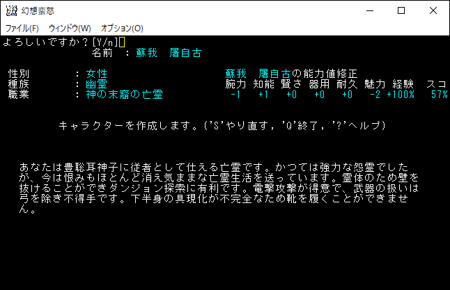物部布都はダンジョンに「皿」を配置して強力な特技を放つユニーククラスだ。事前に準備をするところが本家の鏡使いと似ているのかもしれない。魔法も習得できるので強いキャラクターなのは間違いない。プレイ日記で鏡使い系のクラスを選ぶのは嫌だな。なぜならプレイングで下手クソなのがバレるからだ。頑張ってブログを書いても変愚ファンや東方ファンから馬鹿にされてしまう。物部布都を選択するのはやめておきます。どうせ頑張るのなら幽々子みたいに欠点が多いけどロマンのあるキャラクターを選びたい。