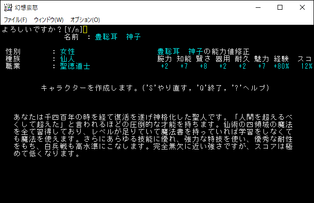 豊聡耳神子は完全無欠の聖人です。「神秘、生命、破邪、自然」の魔法領域を全て使用することができます。そんなにHPは高くないけれど近接戦闘も得意だ。さらにダメージの期待値が1000を越える特技を習得します。wikiには「ゲームに慣れた人がこのキャラを使うと強すぎて退屈する」と書かれていました。wikiに「強すぎるからやめろ」と書かれてしまうのが豊聡耳神子なんですよ。俺はこのゲームに慣れていない人なので神子をプレイキャラクターの候補にします。