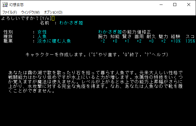 わかさぎ姫は水地形の上に移動すると能力が強化するユニーククラスです。水地形だと近距離攻撃、遠距離攻撃の火力が上がるため、与ダメージ量だけを見れば深層ユニークに対抗できる性能がある。しかし、火力の高さに恵まれているとはいえ、ネックになっていくるのはHPの低さだ(HD12、魔理沙はHD14)。壁抜けの能力を習得できないため、深層ユニークとの戦闘は運ゲーの連続になるだろう。わかさぎ姫のスコア倍率は135%と高いし、間違いなく上級者向けのキャラクターでしょう。