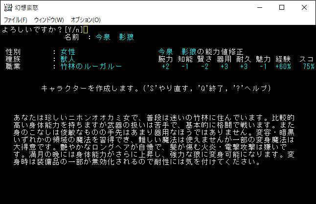 今泉影狼は「変容、暗黒」領域の変化魔法を有効に扱える変身系のユニーククラスです。「爪強化」、「獣変化」、「霧変化」、「悪魔変化」、「魔王変化」を他のキャラクターよりも楽しめるのだ(たぶん)。変容の領域を習得しなくても自身の特技で「狼変身(獣変化)」をすることが可能です。残念ながら魔理沙変化やドラゴン変化にはボーナスがつきません。変身系のキャラクターは総じてロマンがあります。しかし、変身後は耐性が大きく変わってしまうし、巻物などが使用不可能になったりもする。今泉影狼は難しいキャラクターだよ。とても俺では扱えない。