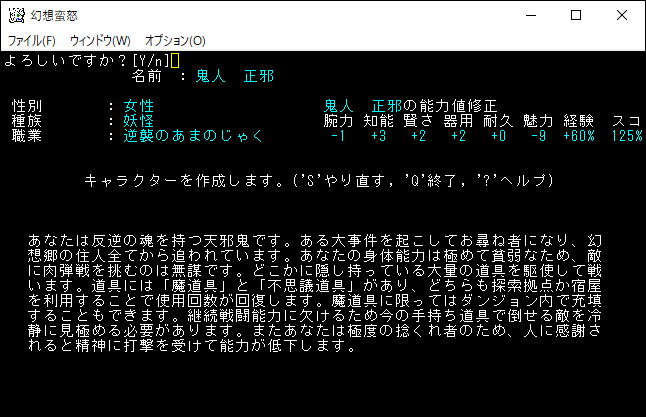 鬼人正邪は本家の魔道具術師を大幅に改造したユニーククラスだ。通常の魔導具を取り込んで攻撃できるし、強力な「反則道具(宿屋で使用回数が回復する特技)」も使えます。嫌われ者のキャラクターらしいので幻想郷のユニークからは常に反感状態だ。しかも、捻くれ者のためクエストを達成してしまうと魅力の値が下がってしまう。それに鬼人正邪には反感などよりも厳しい欠点がある。その欠点とはHDが「0」なのでHPが極めて低くなるというものだ。常に敗北と隣り合わせの状態でプレイするのは無理です。魔道具術師はメチャクチャ楽しいのだけど諦めようぜ。