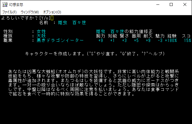 姫虫百々世は卓越した近接戦闘の能力でモンスターを叩き潰していくムカデの大妖怪だ。残念ながら魔法は習得できず、打撃だけしか取り柄はない。しかし、非常にHPが高いので、脳筋プレイで難局を乗り切っていけるのです。また「鉱石」を食べることによりバフのような効果を得られます。この鉱石バフの詳細はわからない。虹龍洞のユニーククラスは最近、実装されたので、wikiの内容が充実していないのです。それでもwikiにおいて姫虫百々世の評価は高いため「バフ&殴り」で爽快にプレイできるキャラクターなのだろう。余談だが「蠱毒のグルメ」という特技名を見て笑ってしまった(笑)。