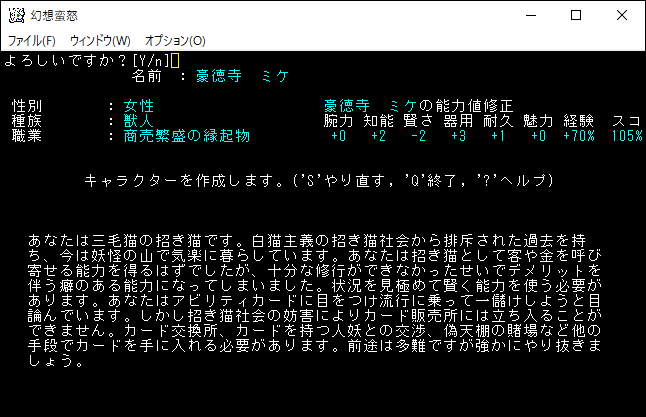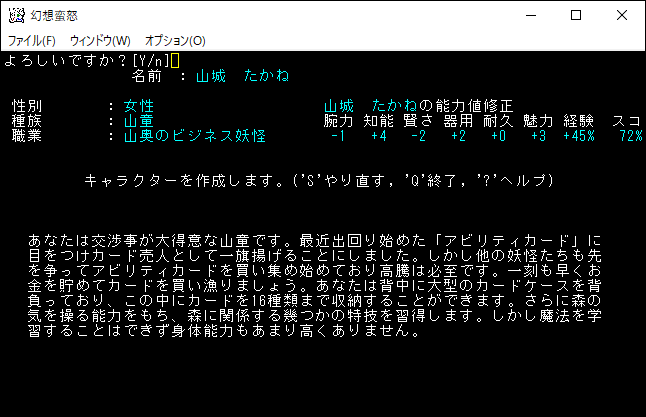 山城たかねもアビリティカードを有効的に活用するクラスです。モンスターからアビリティカードを購入することができます。先ほどの豪徳寺ミケは魔法を習得できました。山城たかねは魔法を使えないが、より多くのカードを所持することができます。たかねはアビリティカードに特化したクラスなのです。豪徳寺ミケとは違ってアビリティカードを持っているモンスターを召喚することはできません。それゆえにカードの収集は難しいけど、最終的には多くのカードを持てる山城たかねの方が強くなるだろう。やべえ!アビリティカードのクラスがメチャクチャ面白そうに思えてきた。プレイキャラクターの候補にしたいけど、ちょっと考える時間をください。ぶっ壊れ系の戦闘能力を持ったアビリティカード系のキャラがいたらそっちにしたい。