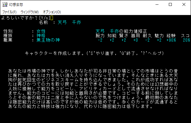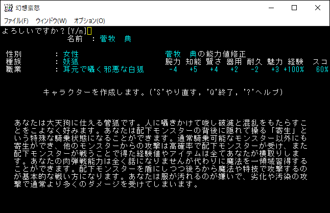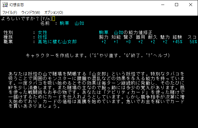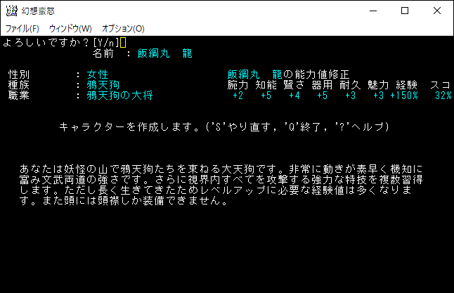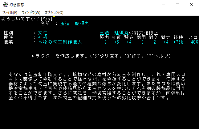 玉造魅須丸は「勾玉」というアイテムを自作して戦っていくユニーククラスだ。勾玉は「鉱石、宝石、一部の珍品」から作成することができます。その勾玉を専用スロットに装備すると、特技や耐性を得ることができるのだ(たぶん)。専用スロットの数はレベルが上昇すると増えます。うーむ、これはまたオリジナリティのあふれるユニーククラスが現われてしまった。魅須丸は戦闘中に装備している勾玉を変更して柔軟な対応ができるのだろうか。勾玉は幻想蛮怒だけの戦闘システムなので魅須丸をプレイキャラクターの候補に入れます。