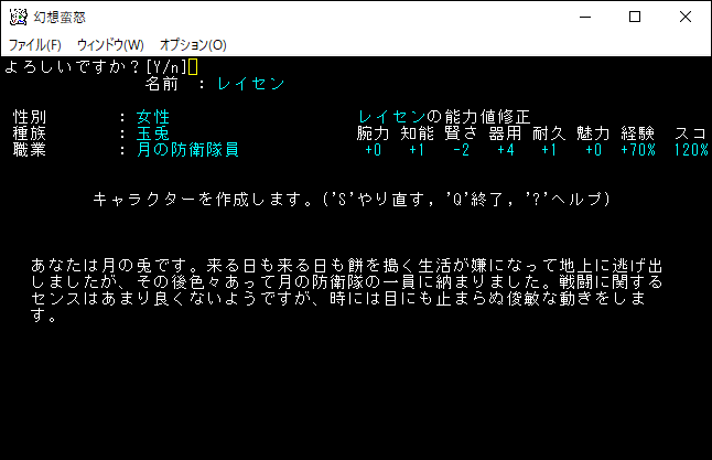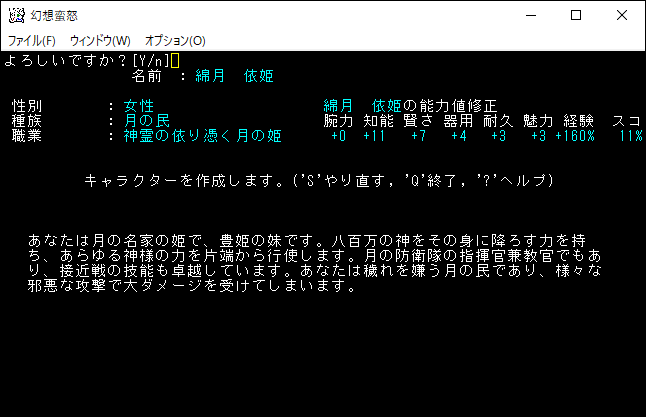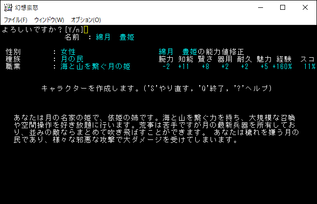 綿月豊姫はテレポート系の特技を沢山おぼえる魔法系のクラスだ。魔法は2つの領域を習得することができます。生命の薬を飲むと五千ダメージをくらって敗北するので気を付けよう。初期装備の「★綿月豊姫の扇」は発動すると威力999のレーザーを発射するため、序盤のユニークはワンパンで倒せるでしょう。さらに永続変異の「白いオーラ」があるから最後の最後までアイテムの収集を楽しむことができる。僕ちゃんは豊姫を操作して無双したくなりました。豊姫をプレイキャラクターの候補に入れます。