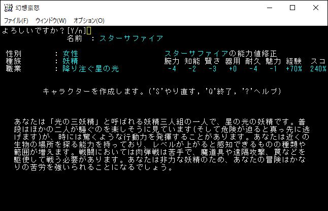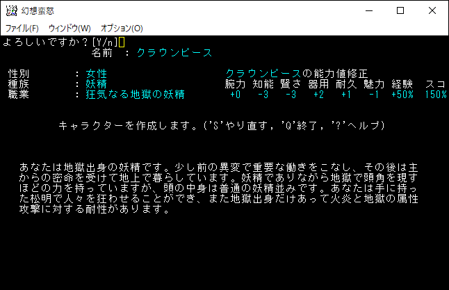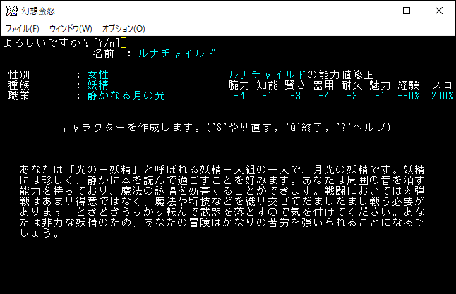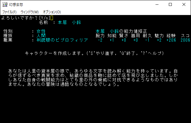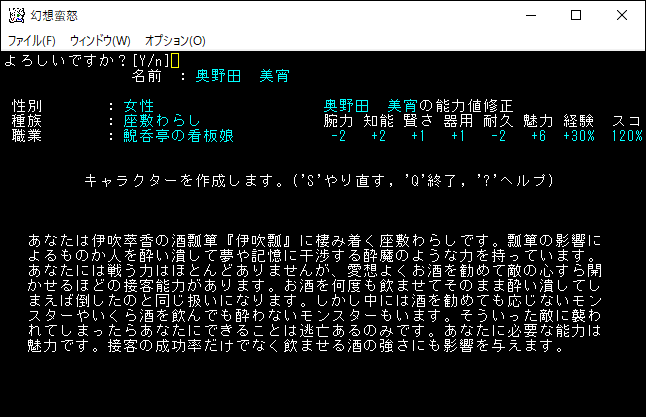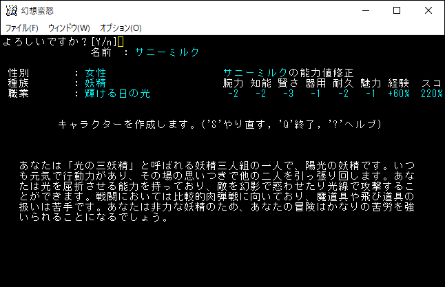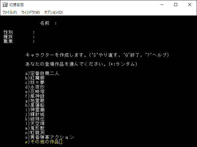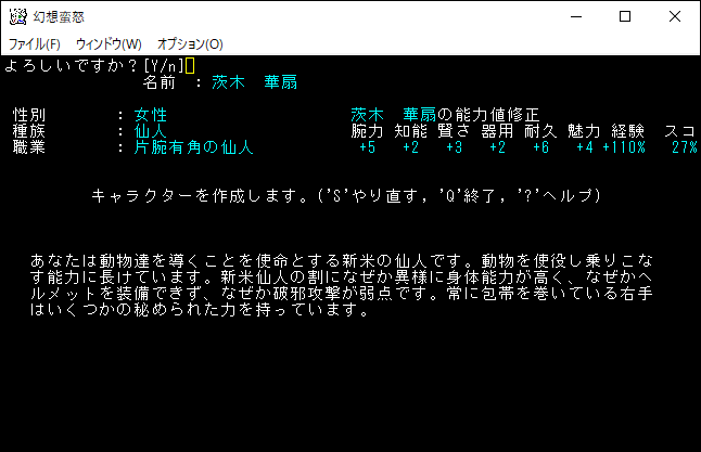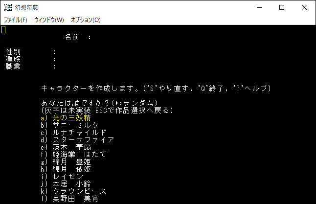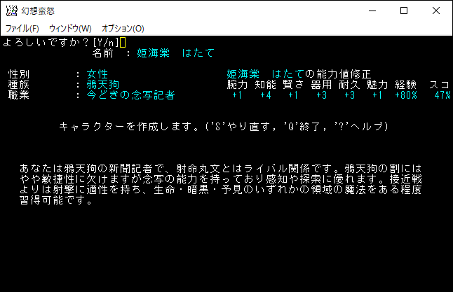 姫海棠はたてはクロスボウや弓の扱いが得意な射撃系のユニーククラスだ。原作だと射命丸とライバル関係のキャラクターです。特技で優秀な感知を覚えられるため、快適に探索することが可能だ。さらに「生命、暗黒、予見」の魔法を1領域習得できる器用なキャラクターです。本家のアーチャーが感知を覚えて、さらに魔法を習得した感じなのかな。*勝利*を狙える強いクラスだけど、幻想蛮怒だけのシステム、すなわちロマンが足りない。今回は選択するのをやめておこう。