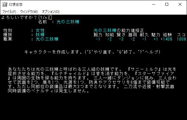 光の三妖精は「サニーミルク」、「ルナチャイルド」、「スターサファイア」の三妖精が3人がかりで戦っていくユニーククラスだ。3人の妖精が交代するのではなく3人が1つのユニットとなり行動するようです。それぞれの妖精の特技である光を屈折させる能力(ルチルフレクション)、音を消す能力(静寂、静寂Ⅱ)、周囲の生物を探る能力(テレパシー)を習得することができます。また3人で1ユニットのため通常よりも多くの装備品を身に付けられます。例えば手の部位には武器2個、盾を1個装備できる。二刀流をしながら盾の装備が可能なのだ。防具は同じ部位に3つの装備品を身に付けられます(身に付ける防具の上限は8個まで)。ただし永続変異に「つまづいて物を落とす」があるため注意が必要です。光の三妖精は強いですわ。なんとなくロマンがあるようにも思える。プレイキャラクターの候補に入れましょう。