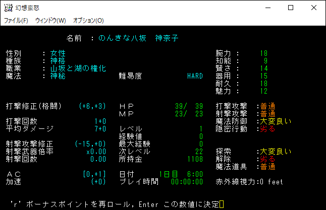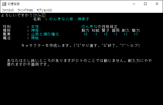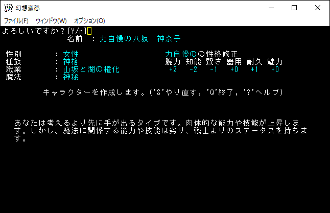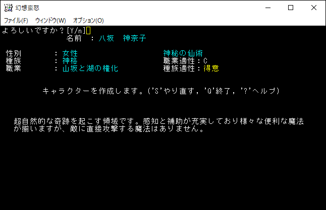 八坂加奈子の説明文が表示されました。原作の加奈子がどういったキャラクターなのかは知らないけど、このゲームの加奈子はユニークモンスターを倒すことにより強くなっていきます。特技という加奈子だけの能力や、魔法を使えたりもします。Enterを押して次に進みましょう。