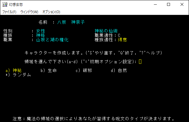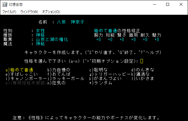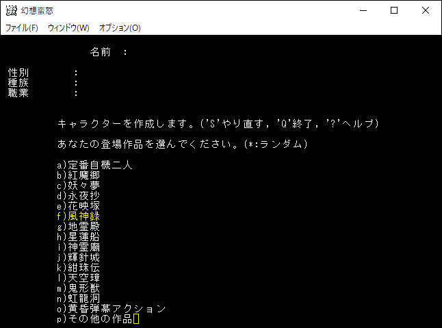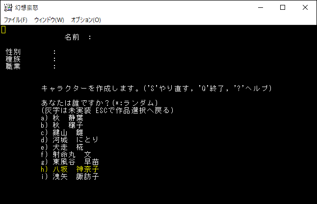 今度は3つの選択肢が表示されました。ここで「a)幻想郷で少しは名の知られた者だ。」を選ぶと東方Projectのキャラクターをプレイキャラクターにすることができます。他の選択肢にすると自分が創作したキャラクターや自分自身を登場させることになります。東方Projectのゲームなのに男性のキャラクターを登場させることもできる。私は「a)幻想郷で少しは名の知られた者だ。」を選択します。