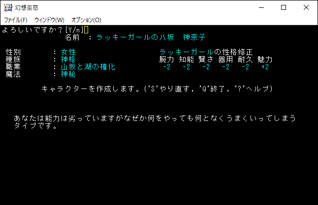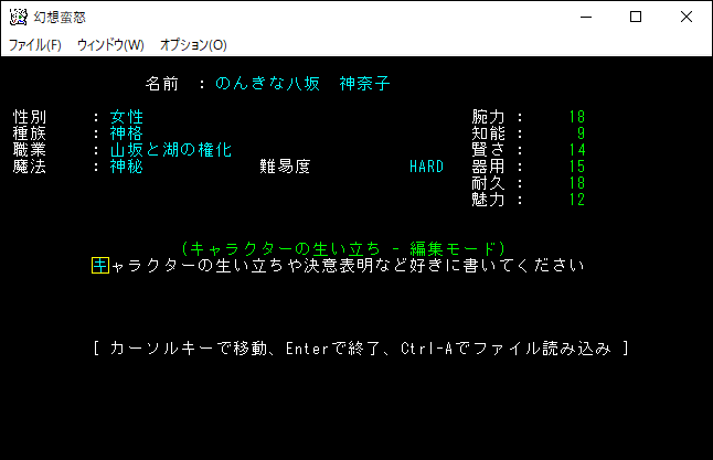 ここでキャラクターの生い立ちを自由に書くことができます。どんな容姿をしているとか、あるいは過去に辛いことがあったとかです。ゲームをクリアしたり、モンスターに倒されたら作者様のサーバーにダンプを送れるので、面白い生い立ちを書いてください。変な生い立ちを書いたら恐ろしい事になると思います。私は何も書かないでEnterを押しました。