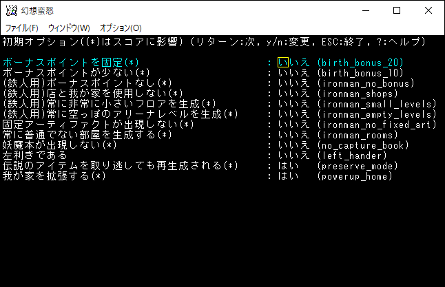 性格が決まったのでEnterを押したところ上の画面が表示されました。ゲーム開始前にこんな設定画面ってあったっけ?もう何が何だか忘れてしまったよ(笑)。左利きにしてあとは何も設定せずにEscを押します。