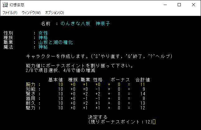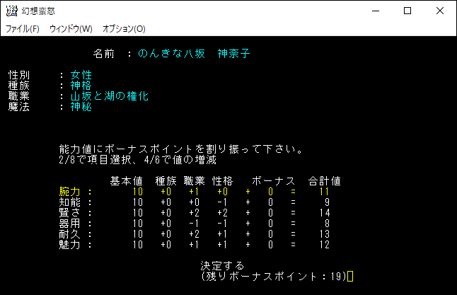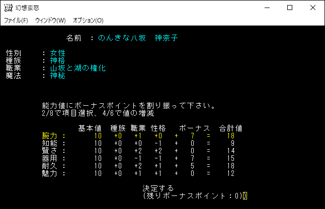 腕力と器用を2ずつ上げました。ボーナスポイントは0だから、もう能力値は上げることはできない。「↓」を押して「決定する」の場所でEnterを押します。