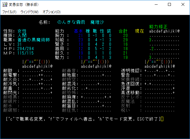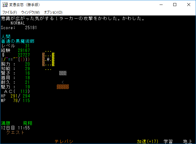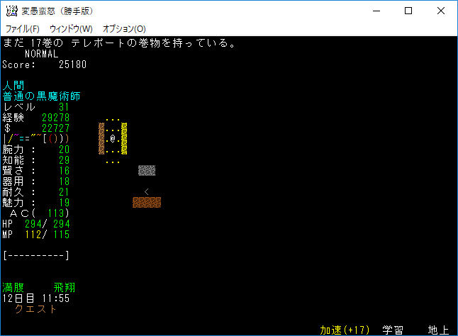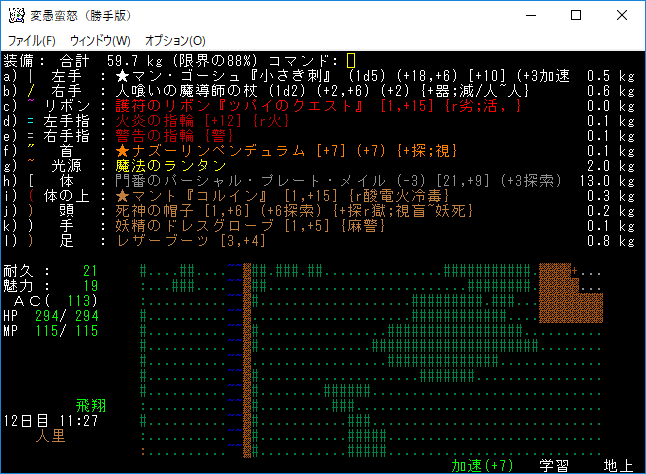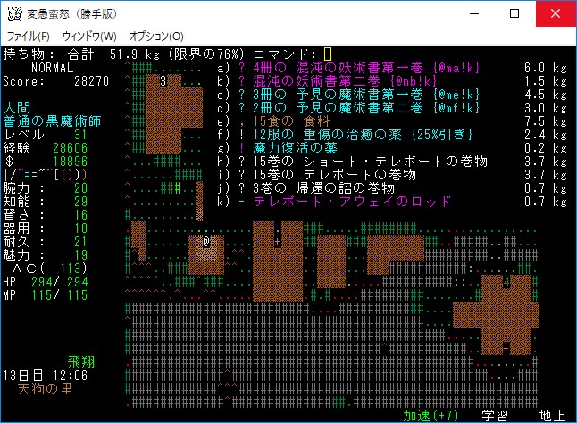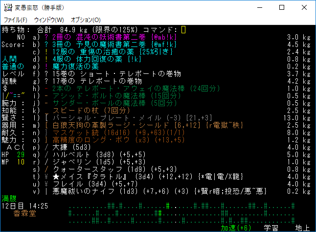 装備は隠密を捨てて耐性重視にしております。いきなりテレポートの巻物を読んでサンダーボールの魔法棒を乱射するから隠密は捨てました。