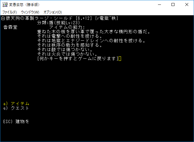 こいつは地獄耐性のある盾か。メイジはアーティファクトの武器を2刀流できるから盾は使わないかも。いちおう売らずに保管しておきます。