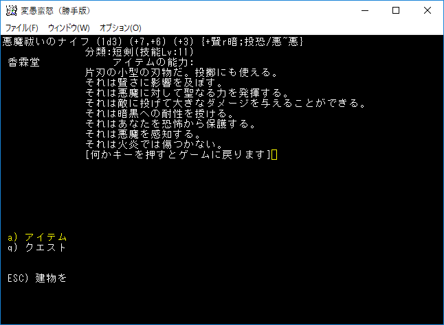 妖術書を手に入れるのに時間がかかった。魔理沙に飲ませてあげるジュースは次回手に入れます。そういえば霖之助にクエスト達成の報告をしていない。『ミミックの財宝』は麻痺知らずの指輪が報酬です!グダグダすぎるなあ!