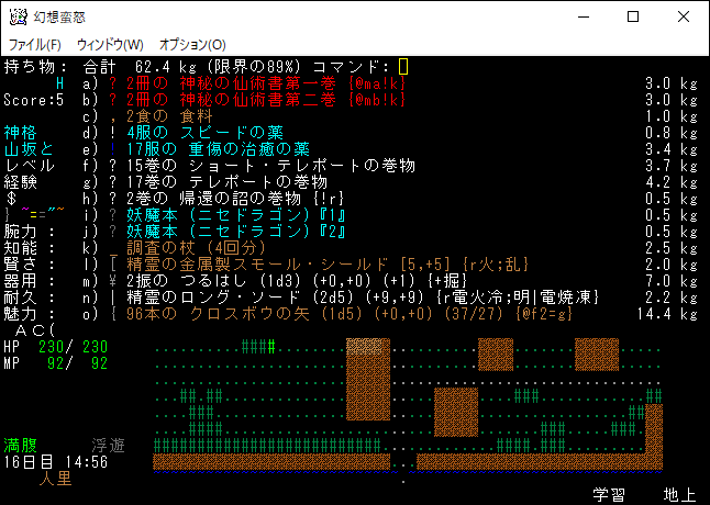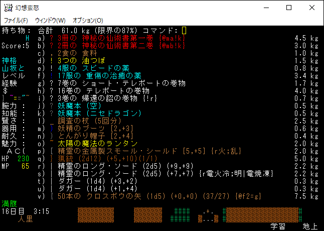今回の投稿はここで終わりにします。現在の所持品は上の画像。次回は下水道クエストに挑む予定だったが中止しようと考えています。下水道クエストは増殖するモンスターが多数出現する。ゆえにサンダー・ボールの魔法棒など範囲攻撃の手段を手に入れてからにしたい。