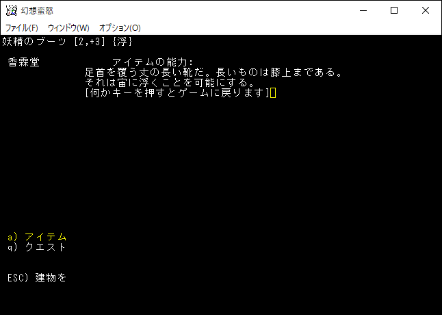 妖精のブーツの*鑑定*結果は上の画像。追加耐性を期待したのだが、浮遊しか付いていなかった。つーか、妖精エゴのブーツって追加耐性が付くのかな。よくわからないけど売ってしまおう。