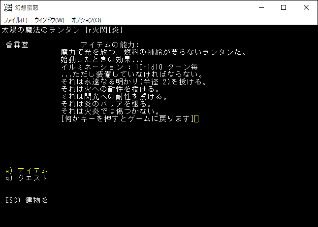 というわけで人里に帰還したときの所持品は上の画像。シャグラトからの戦利品は妖精エゴのブーツと精霊のロングソードです。太陽のランタンは別のユニークモンスターがドロップしました。この3つの装備品を*鑑定*してあとはお店に売却します。