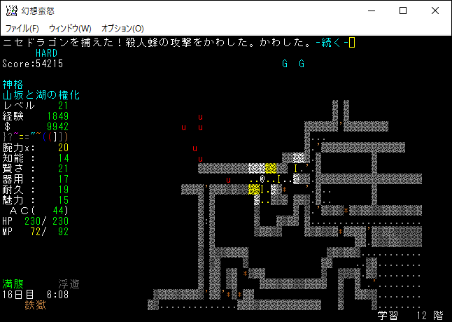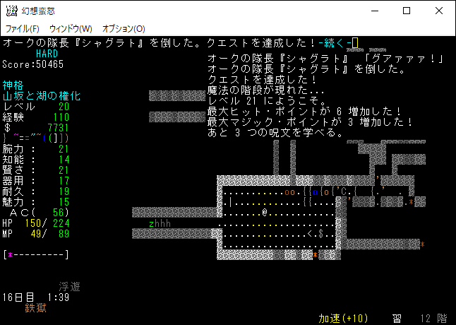 ショートテレポートで逃げつつ、速攻で『シャグラト』を撃破しました。そしてレベルが21に上がった。さらに信仰ポイントをゲットできたようです。なんとか地下12階のランクエを達成したぞ。討伐対象のシャグラトがいきなり近くにいたのは幸運だった。