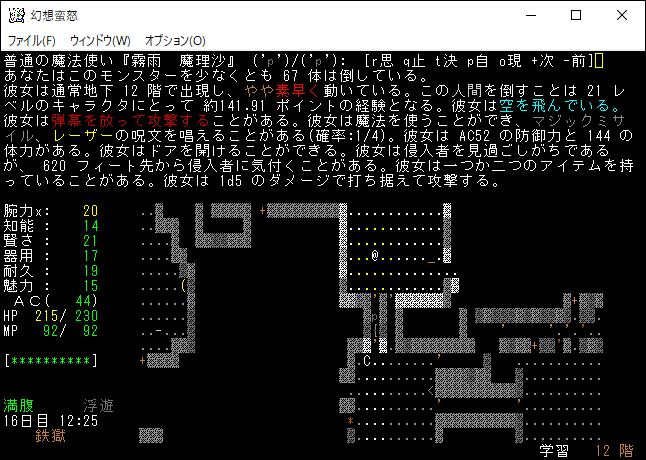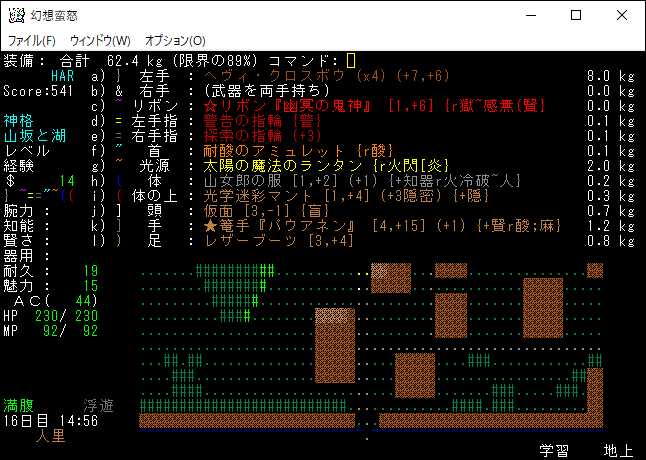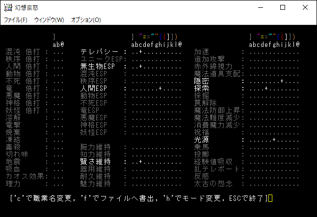 現在の能力値は上の画像。ゲーム開始時に比べたら隠密の技能がマシになった。だけどこの隠密では範囲攻撃や視界内攻撃を使わないと下水道のモンスターを駆逐できない。