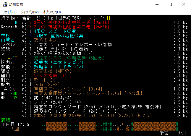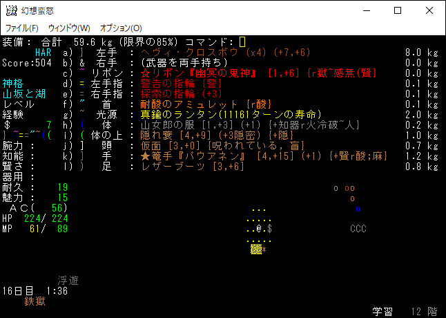 現在の所持品は上の画像。2匹目のニセドラゴンを捕えようとしたら間違えて地下12階に降りてしまったのです。クロスボウの矢が59本しか残っていないため短期決戦を狙うしかない。