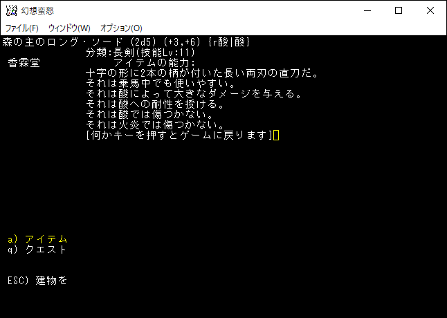 精霊のロング・ソードの*鑑定*結果は上の画像。耐性やスレイがすでに所持している精霊エゴの剣と全く同じだ。同じ武器を2個持っていても意味がないので片方を売ります
