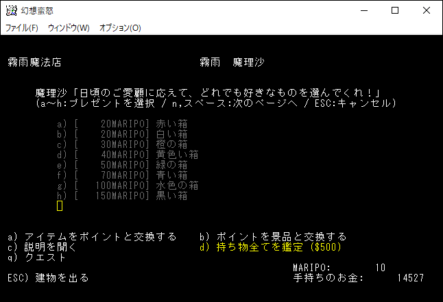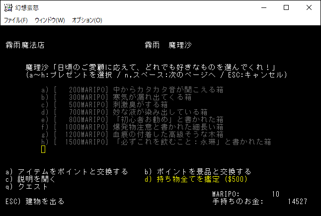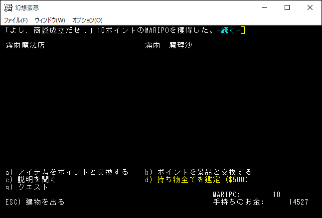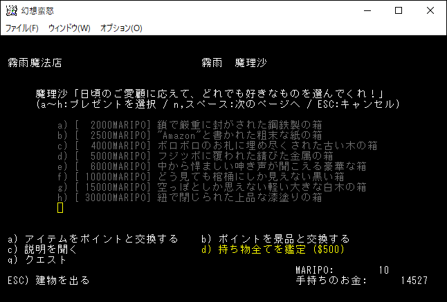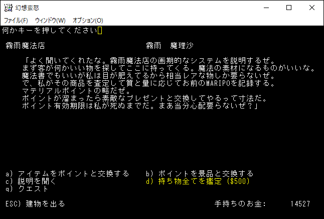 まずは「c)説明を聞く」を選択します。魔理沙の説明によると、ここに来て魔法の素材を渡せば「MARIPO」というポイントを貯められるらしい。そしてMARIPOを貯めると魔理沙から素敵なプレゼントを頂けるのです。ちなみにMARIPOはマテリアルポイントの略称なんだってさ。俺はマリサ・ポイントの略かと思っていた(笑)。