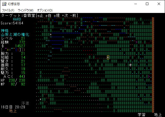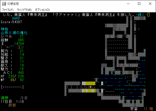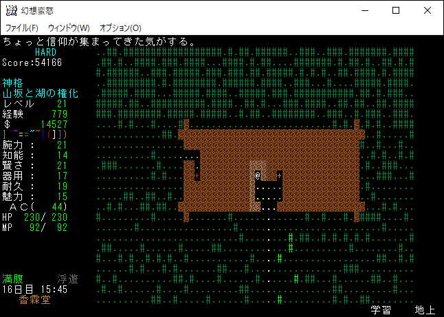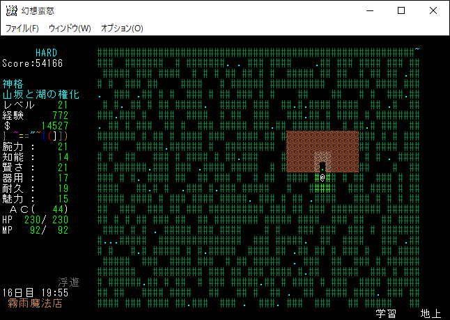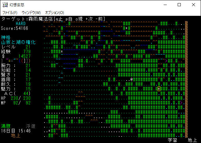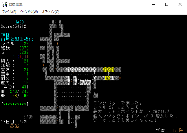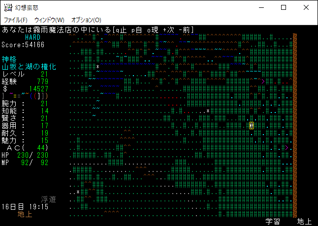 幻想蛮怒のプレイ日記を始めます。難易度HARDの八坂加奈子をプレイ中です。前回は鉄獄の地下12階ランダムクエストを達成しました。今回の投稿は鉄獄の地下15階あたりでレベル上げをします。鉄獄を探索するだけの投稿だと地味だから霧雨魔法店に行ってみようかな。